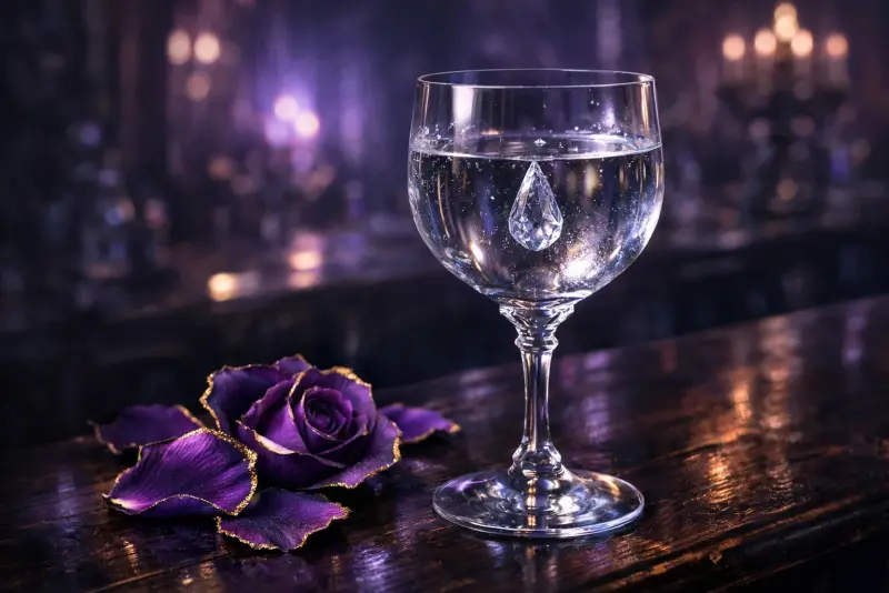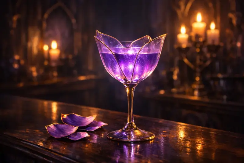 A violet floral liqueur that glows softly in the dark; served in slender petal-shaped glasses, perfect for refined guests.