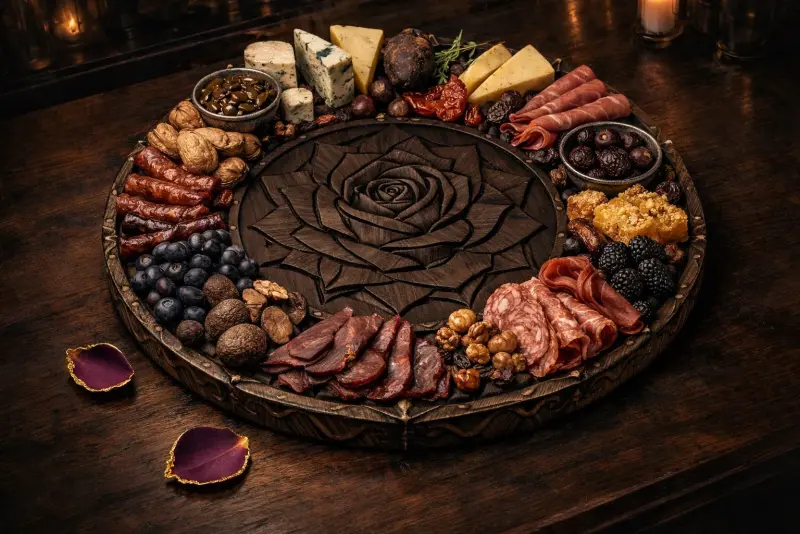 A grand platter of aged cheeses, marinated delicacies, smoked and cured meats, truffles, and dark berries, arranged as a magic circle with the Nightblossom symbol at its center.