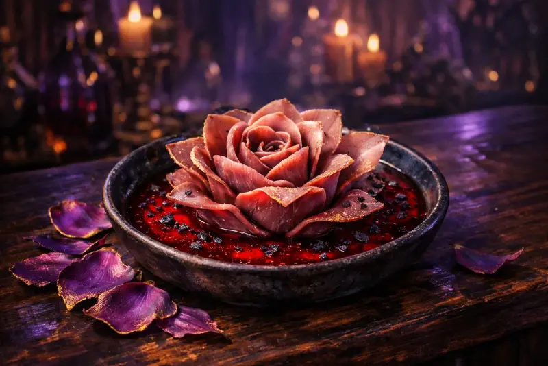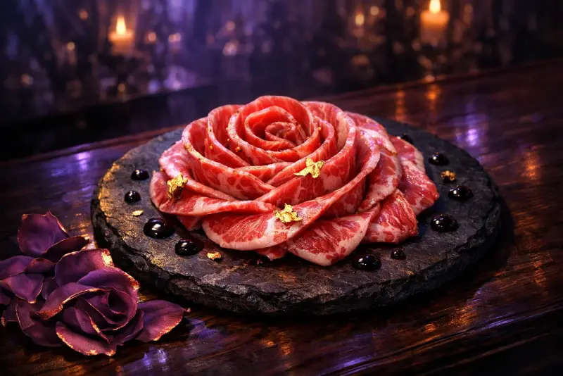 Thinly sliced delicacy tongue or fillet arranged like a blooming flower, served with a blood-red spicy sauce and flakes of black salt.