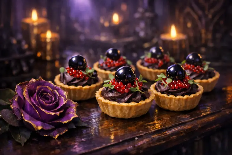 Tiny tartlets filled with dark mousse, red caviar, and microgreens, each crowned with a small "pearl" of sauce.