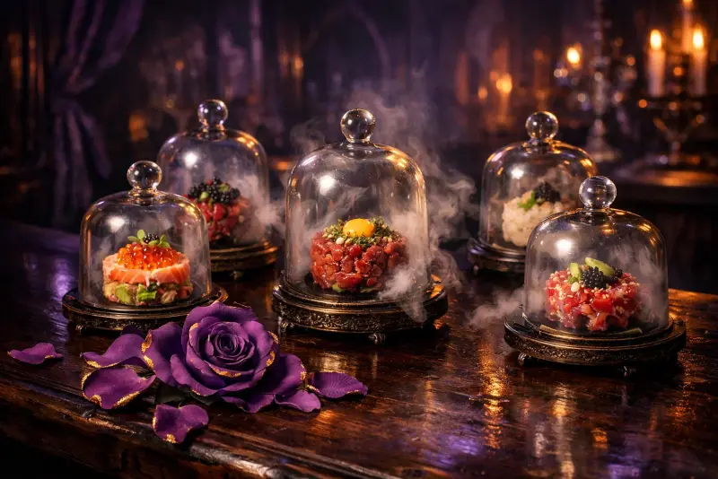 An assortment of miniature tartares (from different meats or fish), each under its own glass dome filled with smoke, released in front of the guest.