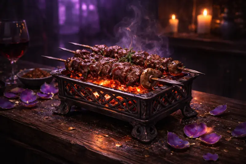 Small skewers of juicy meat and mushrooms marinated in dark wine and herbs, served over a miniature brazier so the guest can finish them to their preferred doneness.