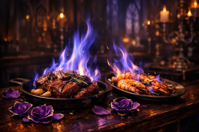 Choice cuts of fine meat or seafood prepared flambé; they flare up with blue or violet fire at the table, briefly illuminating the guest's face.