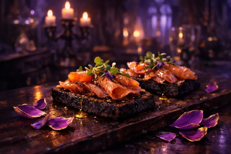 Thin slices of smoked fish or meat on toasted black bread with truffle oil and microgreens; each bite carries the essence of ancient volcanic fires.