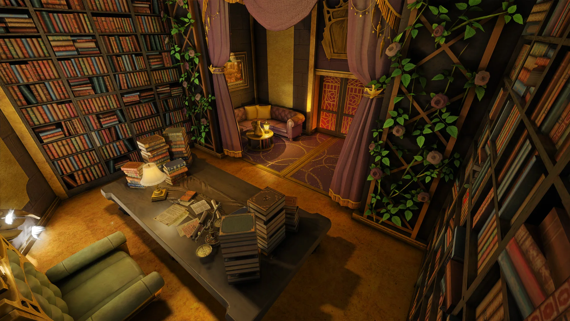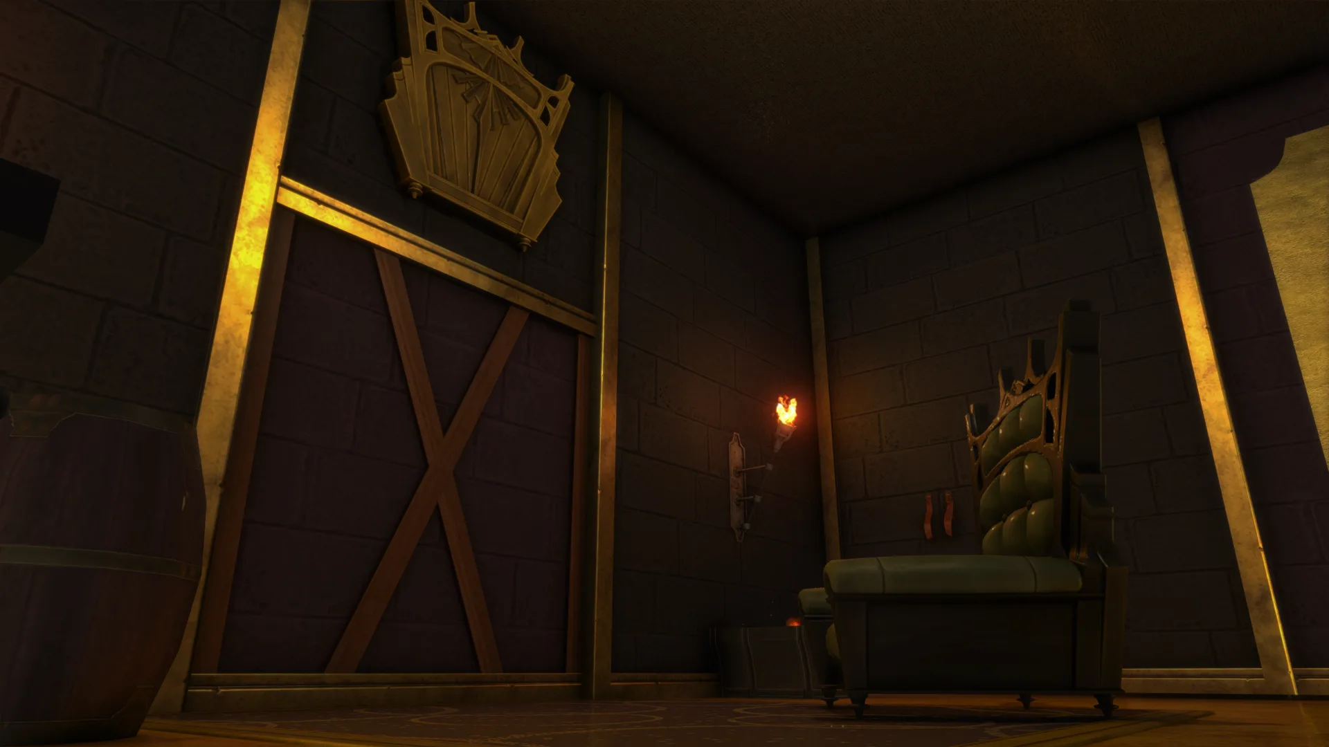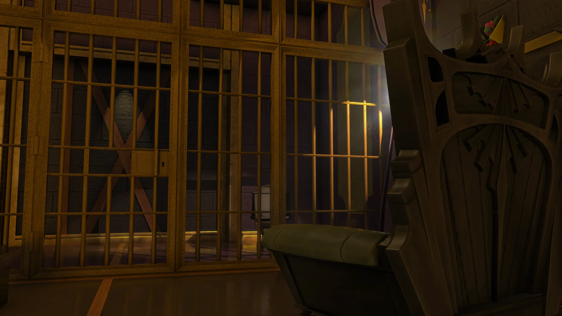 A chamber of velvet hush and measured command. Gold-barred confines and violet drapery frame a raised throne of judgment.