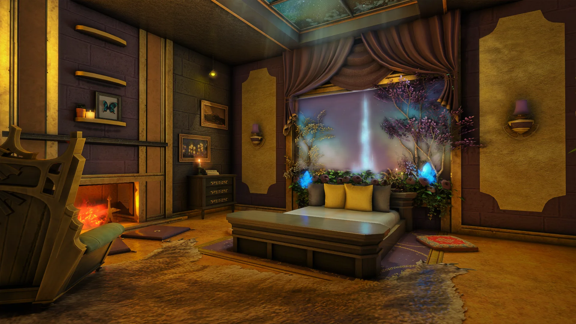 A romantic refuge of fur and firelight. Gilded stone and candlelit walls cradle a roaring hearth, where warmth softens every word and closeness blooms in the hush of embers.